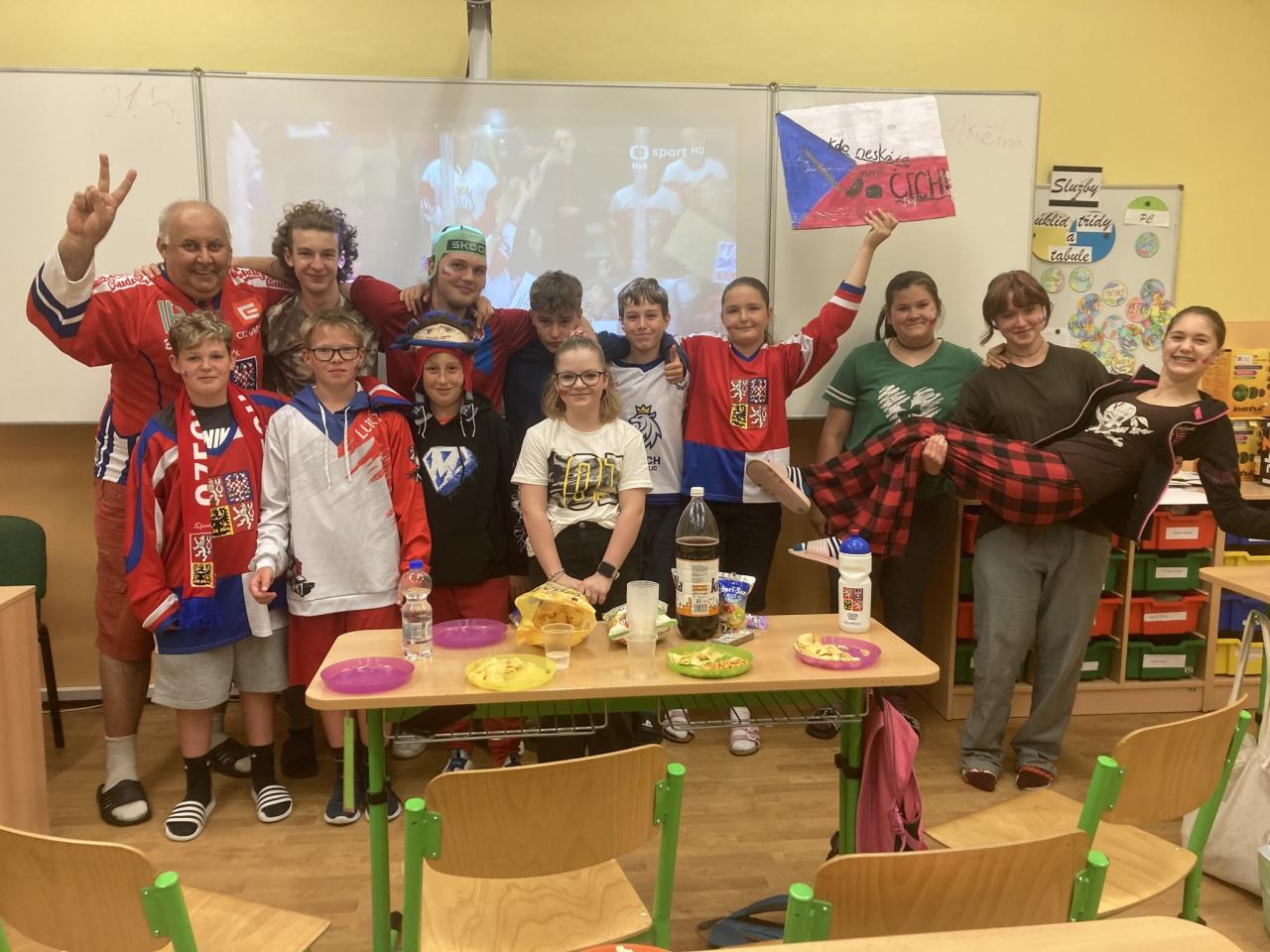 Největší školní fanoušci při společném sledování napínavého utkání MS v hokeji ČR x Kanada. Nakonec jsme si 3x zakřičeli GÓL, ale nestačilo to a v prodloužení jsme prohráli. My jsme si to ale užili a fandili naplno. Takže : Kdo neskáče není Čech - hop, hop, hop a zlato je naše!